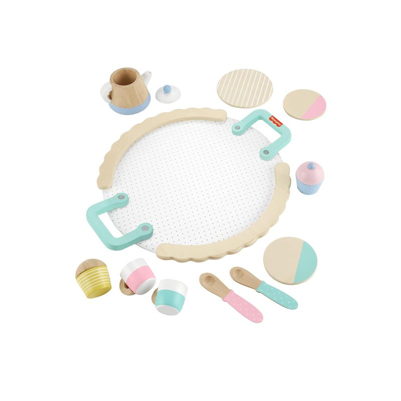 Incluye bandeja para servir, tetera con tapa, 2 tazas de té, 2 platillos, 2 cucharas, 2 cupcakes y 1 plato.