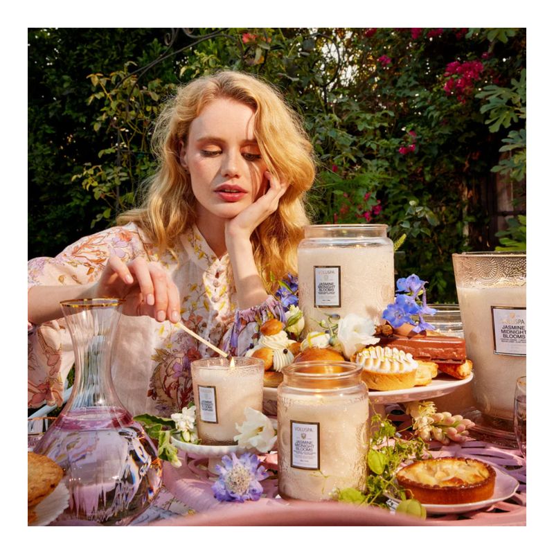 La luna creciente despierta las flores de su letargo con aromas de bergamota italiana y flor de luna. Emocionantes notas de jazmín egipcio y nardo invaden los sentidos, iluminando sus largos tallos y pétalos arqueados. Floreciendo con la bravura de la hierba de duna y la madera de mango, las damas de la noche llegan en plena floración, esparciendo su fragancia por el aire nocturno como dulces secretos que besan el oído. Una fragancia audaz, tan intensa como su belleza. La exclusiva mezcla de cera de coco de Voluspa se vierte a mano en un recipiente de vidrio repujado de 400 ml y cuenta con una tapa a juego que mantiene la vela libre de polvo cuando no se usa. Las dos mechas incluidas permiten disfrutar de la fragancia durante 60 horas.